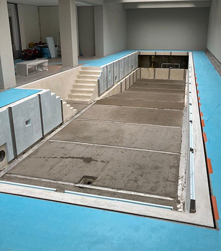 Lors du retrait de toutes les anciennes couches et des éléments décoratifs, plusieurs surprises sont rapidement ap- parues. Il a donc été décidé de recouvrir entièrement le caisson du volet roulant existant d'inox, ce qui garantit une étan- chéité permanente à 100 %. Le système d'enroulement a également été modifié : désormais, la piscine fonctionne avec un moteur tubulaire interne. De plus, le bassin a été isolé sur place avec une isolation XPS. « Nous avons ensuite appliqué une couche de chape sur le fond afin de créer une sur- face plane », explique Jirky Van den Bergh. « Puis nous avons entamé les travaux de soudure. En raison des dimensions impor- tantes de la piscine et de sa complexité technique, l'ensemble du processus de soudure a duré environ trois semaines. Entre-temps, nous avons également en- tièrement rénové et automatisé toutes les installations techniques dans la cave. » Un contrôle approfondi de la tuyauterie existante s'est avéré indispensable. « On ne peut pas proposer une rénovation à vie de la cuve et se retrouver ensuite avec une fuite », explique M. Van den Bergh. La forme de la piscine a également posé des défis supplémentaires. Le bassin avait différentes profondeurs et des rebords saillants. Tout au fond, le sol descendait à près de trois mètres de profondeur. Chaque surface devait donc être réalisée sur mesure, au millimètre près. De plus, le propriétaire souhaitait un résul- tat aussi épuré et homogène que possible. « Il ne voulait absolument pas de soudures apparentes », explique M. Van den Bergh. « Même si celles-ci sont extrêmement fines grâce à notre technique de soudage au laser. » Pour perfectionner ce détail vi- suel, nous avons opté pour des profilés en U qui permettent de dissimuler complète- ment toutes les soudures. « Pour pouvoir profiter pleinement du résultat final, l'es- thétique doit être irréprochable. C'est la finition qui fait la différence. »
