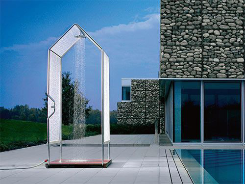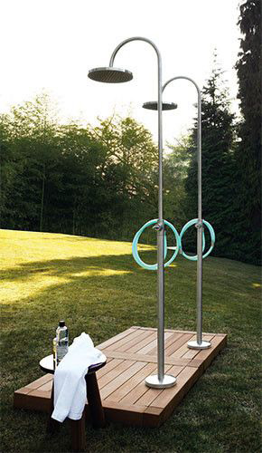 Uit Italië komen de buitendouches van Arkema die stuk voor stuk een beroep doen op de hitte van de zon om het water op te warmen. De technologie werd in 1988 door Giancarlo Rusconi ontwikkeld en is sindsdien alleen maar verfijnd en helemaal op punt gesteld. Zo is er deze Spring douche met gebogen design, gemaakt uit aluminium en voorzien van een reservoir met een inhoud van 30 liter water dat kan worden opgewarmd door zonne-energie. Verkrijgbaar in diverse kleuren. Richtprijs: vanaf € 605,00 tot € 726,00, afhankelijk van uitvoering en eventuele accessoires. (foto Arkema)