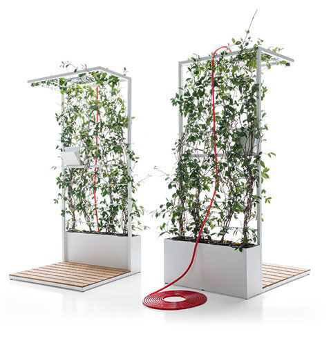 Is het een plantenbak... of is het een douche? Dit model van Falper weet beide functies fraai te verenigen. In combinatie met een klimplant naar keuze gaat deze ‘gecamoufleerde’ buitendouche perfect op in zijn natuurlijke omgeving. Gemaakt van gegalvaniseerd en gelakt staal en vlonder in teakhout. Design: Giovanna Talocci. Richtprijs: € 4.719,00. (foto Falper)