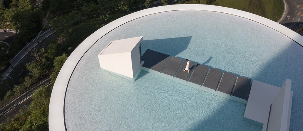 Langs welke kant je dit gebouw ook bekijkt, deze Water Drop Library blijft telkens opnieuw verrassen. Vooral van bovenuit gezien komt de bijzondere en geometrische vormentaal, bestaande uit een rechte lijn en een cirkel, helemaal tot zijn recht. “Het ontwerp van deze bibliotheek streeft naar een poëtische spanning”, aldus de architecten van 3andwich. Het gebouw zelf is cirkelvormig, met op het concave dak een komvormig bad. De rechte lijn wordt gevormd door de witte loopbrug met hoge muur die leidt naar de ingang onder het zwembad. Al is de term ‘onderwaterbibliotheek’ misschien wat misleidend, dat is het in se wel.