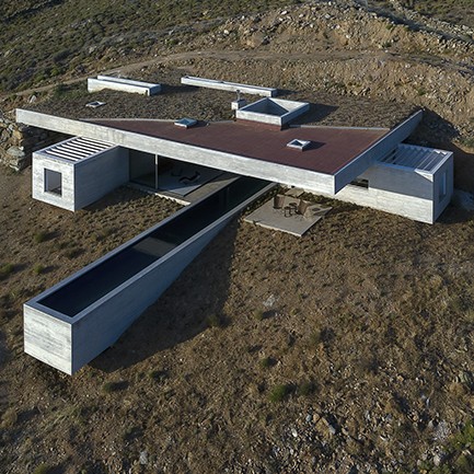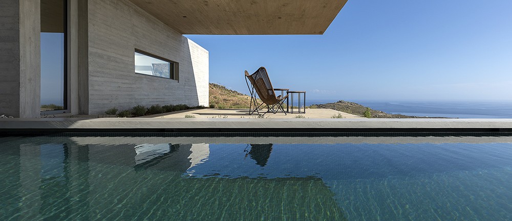 Toegegeven, het is wel heel wat anders dan de traditionele Griekse witte huizen. Zichtbaar beton zet de toon. Het ingetogen kleurenpalet vond inspiratie in de kleur van de rotsen, terwijl de materialiteit en texturen van het kale beton de synergie tussen het gebouw en de omgeving verder ten goede komt. Eén enkele betonplaat, zo ingeplant dat het net een verlengstuk lijkt van het landschap, bedekt de drie bouwvolumes die de bewoners voorzien van alle wooncomfort. De twee volumes die loodrecht op elkaar vanonder de plaat uitsteken, vormen samen de privéruimtes, de slaapkamer en een gastenverblijf.