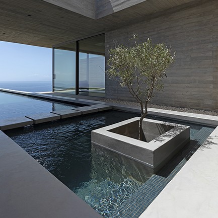 De dakplaat, die achteraan overgaat in de grond, vormt aan de andere zijde een grote uitkraging. Deze overkapt onder meer het terras en zorgt voor welgekomen schaduw wanneer de temperaturen oplopen. Maar ook in de woonkamer is de verbondenheid met de omgeving groot. Bij mooi weer schuiven de glazen wanden helemaal open en wordt binnen buiten. Tussen deze leefruimte en het terras: het zwembad dat zich vastberaden uitstrekt richting horizon en naar het einde toe een stukje boven de heuvel zweeft. Het helderblauwe water zorgt voor een boeiend contrast met het kale en ruwe beton, als een interpretatie van de interactie tussen natuurlijke elementen. Ook opmerkelijk: de door beton omkaderde opening in het wateroppervlak waaruit een grillige boom de kop opsteekt en richting hemel reikt. Schijnbaar zwevende stapstenen verbinden beide ‘oevers’ en zetten de architecturale puntjes op de i. Gewoon pootjebaden, baantjeszwemmen of vanuit het water genieten van het onbelemmerd uitzicht over het eiland? Hier is het genieten geblazen.