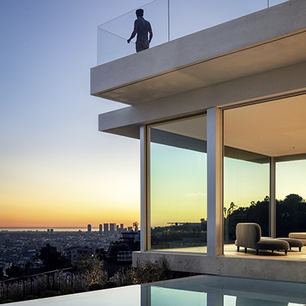 De architecten lieten zich voor het ontwerp inspireren door het modernistische Stahl House van Pierre Koening (Case Study House No. 22), waarvan trouwens een glimp kan worden opgevangen in het westen. Ter erkenning van dit Stahl House werd de voornaamste loungeruimte in een uitkragende ‘glazen box’ ondergebracht, een plek die het uitzicht als het ware omarmt. Het zwembad, een infinitypool links en rechts van deze lounge, lijkt onder het uitkragende volume door te lopen. Hiervoor wordt het gevoel dat het huis ‘zweeft’ verder opgevoerd, terwijl de voorgrond samensmelt met het vergezicht op de Stille Oceaan. Of hoe een zwembad de architectuur niet alleen kan aanvullen, maar ook verder versterken.