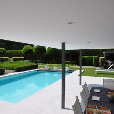 Voor de verlichting van dit liner mozaïekbad zijn RGB-leds van Spectravision gebruikt, voor de zwembadrand en het terras witte, keramische boordstenen. De solar afdekking van T&A is bijzonder goed en verhoogt aanzienlijk het warmte rendement van uw zwembad. Ook isoleert ze beter dan klassieke lamellen. Het poolhouse, in overleg met JR Pools door een externe firma gerealiseerd, is opgetrokken uit hout en kunststof panelen.