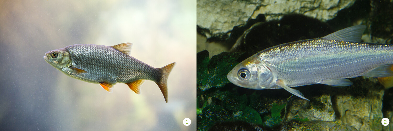 Door bewust de meest gevoelige soorten vissen in je zwemvijver te plaatsen, kan je de waterkwaliteit eenvoudig in de gaten houden. De ruisvoorn of rietvoorn (1) is erg gevoelig voor watervervuiling. De oranje soort hiervan, genaamd de goudrietvoorn, is een prima keuze voor de gezelschapsvijver met planten. In het diepere zwemgedeelte zonder planten voelt deze vis zich minder thuis wat ervoor zorgt dat deze vissoort voor de meeste zwemvijvers minder geschikt is. Een andere vissoort die zeer gevoelig is voor vervuiling is de winde (2). De winde is zeer gevoelig voor zuurstoftekort en diverse types van vervuiling. Hou er rekening mee dat de winde in een school leeft. Ze moet dus samen gehouden worden met andere soortgenoten. Als deze windes goed gedijen in de zwemvijver is dit het bewijs van uitstekende waterkwaliteit. Als er iets niet goed is met het zwemwater gaan de windes scheeftrekken, happen of stilliggen. Ze reageren op het minste probleem.