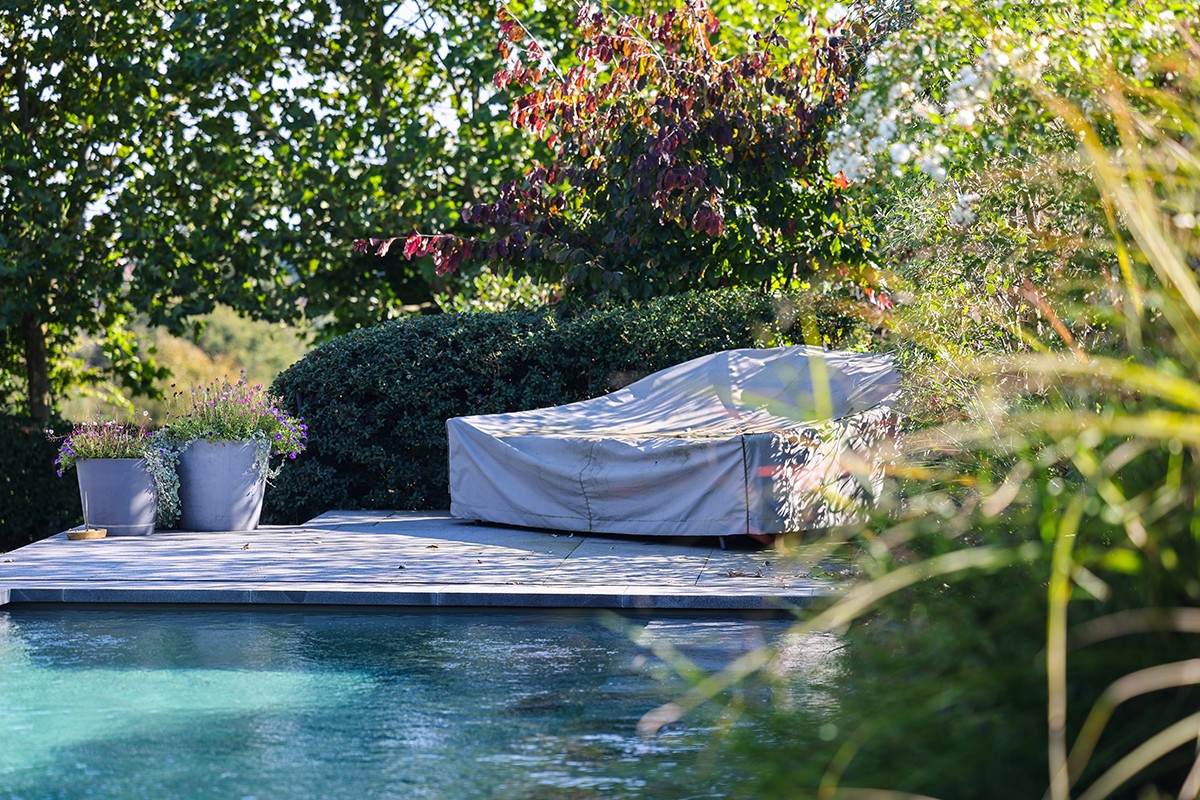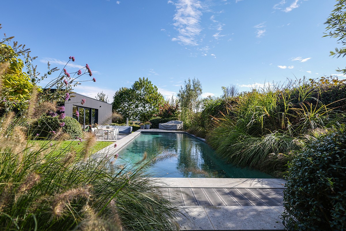 In het landelijke Boutersem vormt deze tuin een natuurlijke verlenging van het omringende landschap. Het organische lijnenspel in de beplanting weerspiegelt de zachte glooiingen van de omgeving en trekt die visueel naar binnen. Deze vloeiende vormen contrasteren op een boeiende manier met de strakke lijnen van de verhardingen, tuinconstructies en het zwembad. Alles is zorgvuldig verweven tot een gevarieerd, maar toch samenhangend geheel.