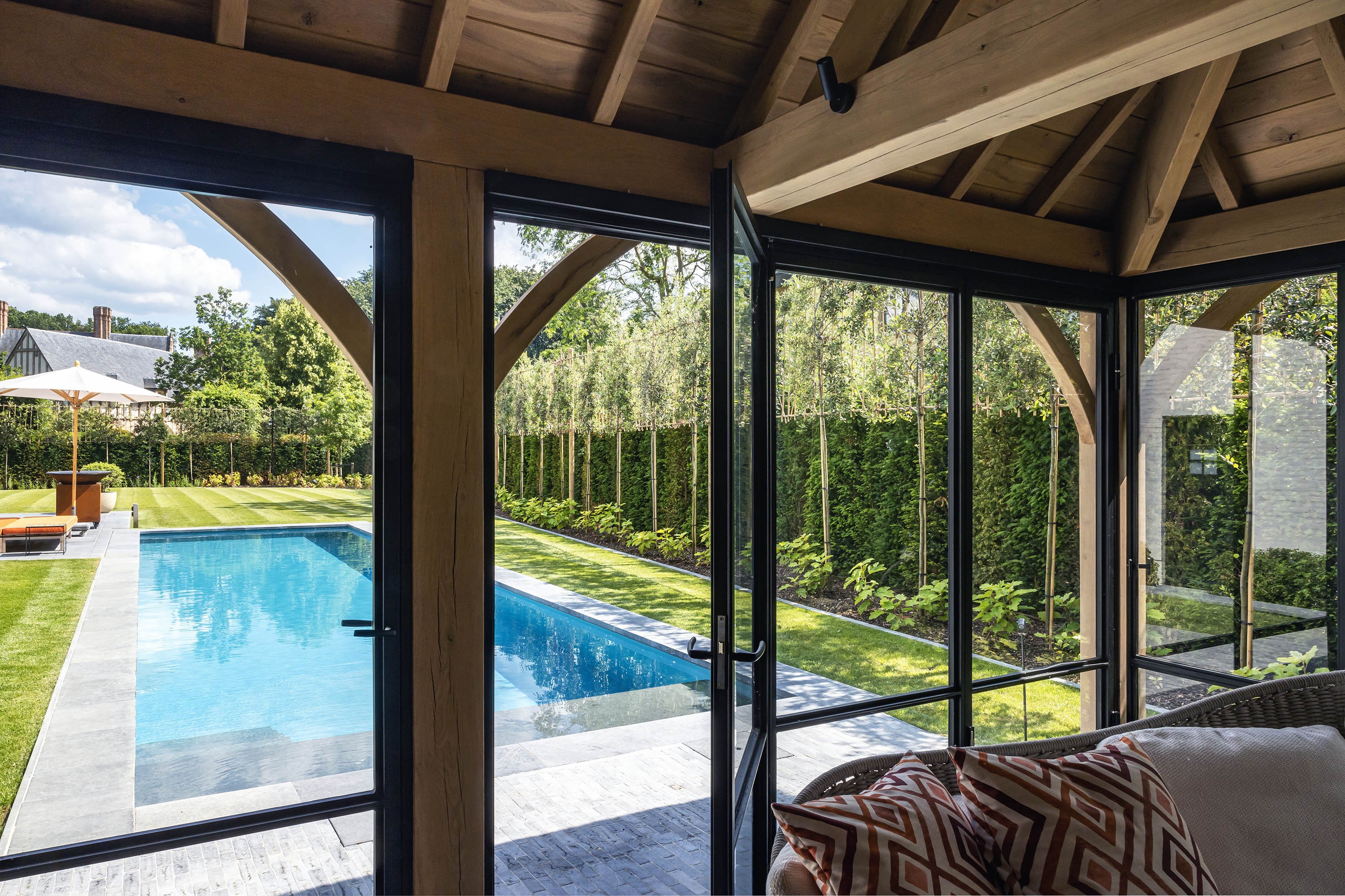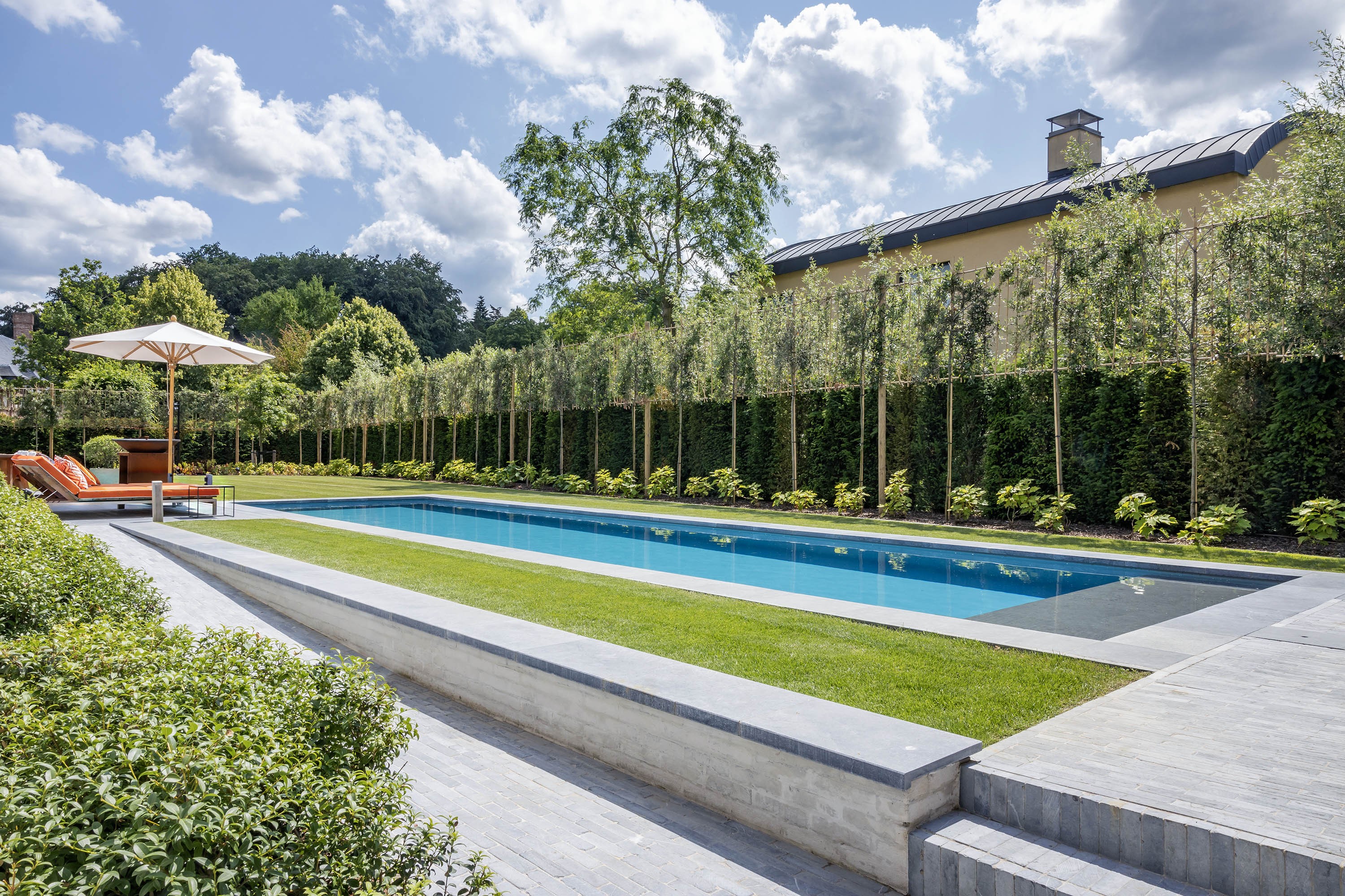 In het prachtige Sint-Martens-Latem prijkt een schitterende landelijke villa, compleet met een indrukwekkend zwembad. Tuinen Dhaenens verzorgde zowel de aanleg van het zwembad, het tuinontwerp en de aanleg van de tuin. Het zwembad is gebouwd uit beton en afgewerkt met een gewapende TPO-liner van Sika, uitgevoerd in een stijlvolle blauwgrijze kleur.