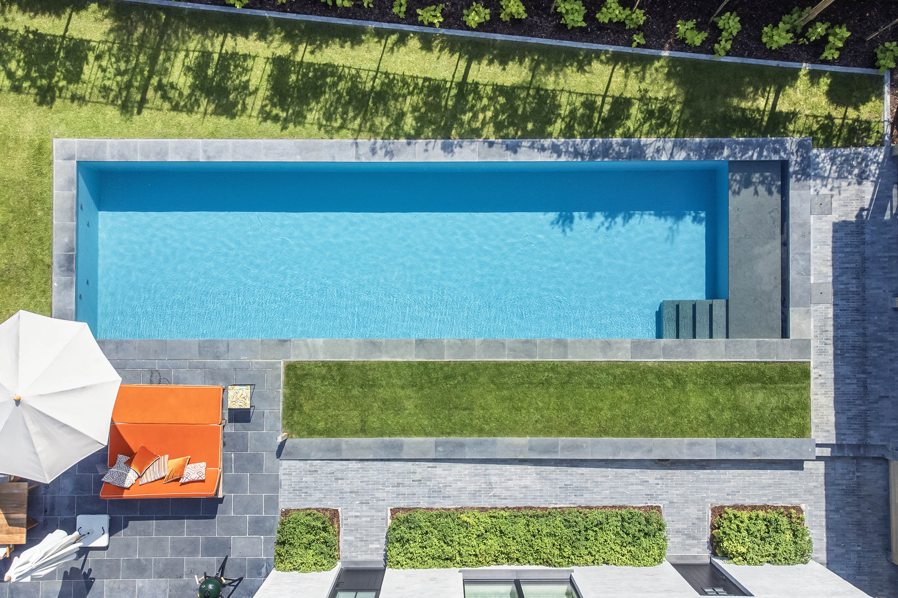 Met een lengte van 14 meter is dit zwembad ideaal voor sportieve zwemmers die graag baantjes trekken. Er is een plage voorzien om op uit te rusten na een zware trainingssessie. Maar ook voor plezier en ontspanning is dit een topbad. Het heldere blauwe water steekt fraai af tegen de warme oranje tinten van de loungeset en de rode pannen van het dak. Een vrolijke combinatie die meteen aan de zomer doet denken.