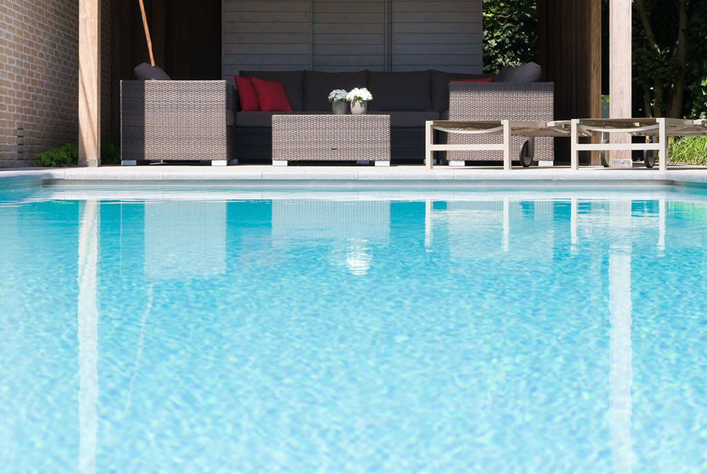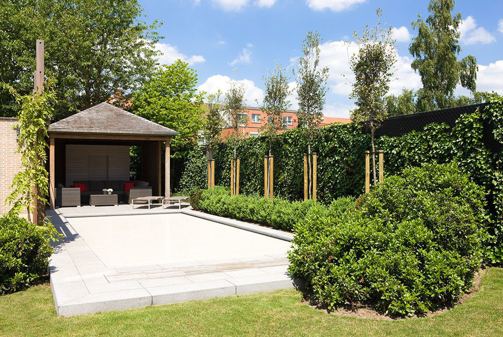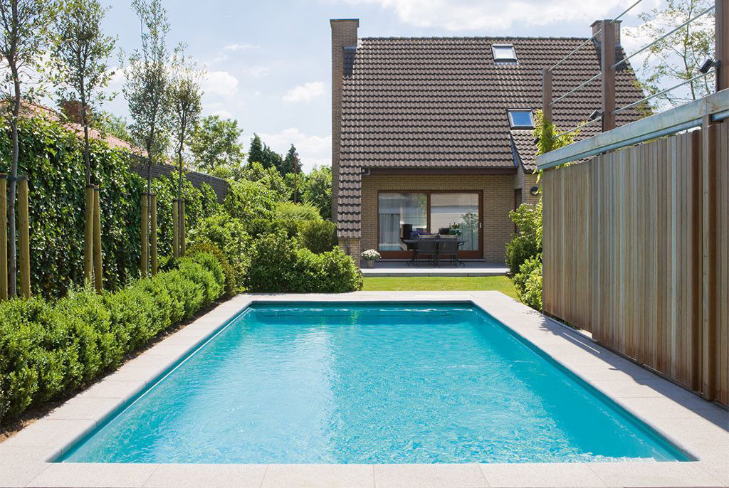 Om de tuin extra dynamiek te geven, werd het zwembad zo’n 15 cm hoger geplaatst en omgeven door een massieve, gebouchardeerde, blauwe granietsteen. Het bad zelf is een rechthoekig vinylester monoblok zwembad met een geïntegreerde hoektrap. Dit Belgisch fabricaat van LPW Ceramic Pools komt met 30 jaar fabrieksgarantie. De afmetingen zijn 9,45 m x 4 m en 1,60 m diep, inclusief een geïntegreerde rolluikkast van 1 m. Omdat de tuin niet erg groot is, werd een schuifwand in hout naast het zwembad geïnstalleerd. Bij grotere tuinfeesten kan de wand open geschoven worden zodat de oprit erachter dienst kan doen als extra terras.