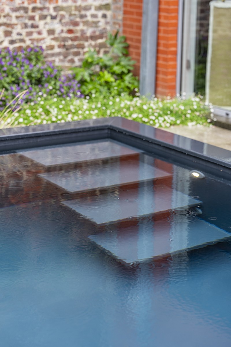 Bij het vallen van de avond is de led-onderwaterverlichting de sfeermaker. Strategisch geplaatste spots van DuraTech lichten het water op, accentueren de strakke contouren van het bad en laten de tuin in sfeerlicht baden. Met deze Visio Pro-spots is de intensiteit van de verlichting aanpasbaar, net als de kleur. Dat biedt de eigenaars de flexibiliteit om de sfeer naar wens te creëren.