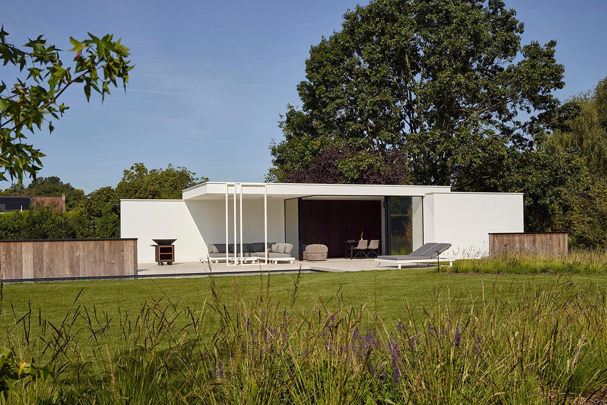 Dit poolhouse is een toonbeeld van moderne eenvoud. De strakke, witte gevels en het zwevende dak met slanke kolommen geven het geheel een lichte en open uitstraling. Grote schuifdeuren zorgen voor een vloeiende overgang tussen binnen en buiten, waardoor de tuin en het zwembad naadloos aansluiten op de leefruimte.