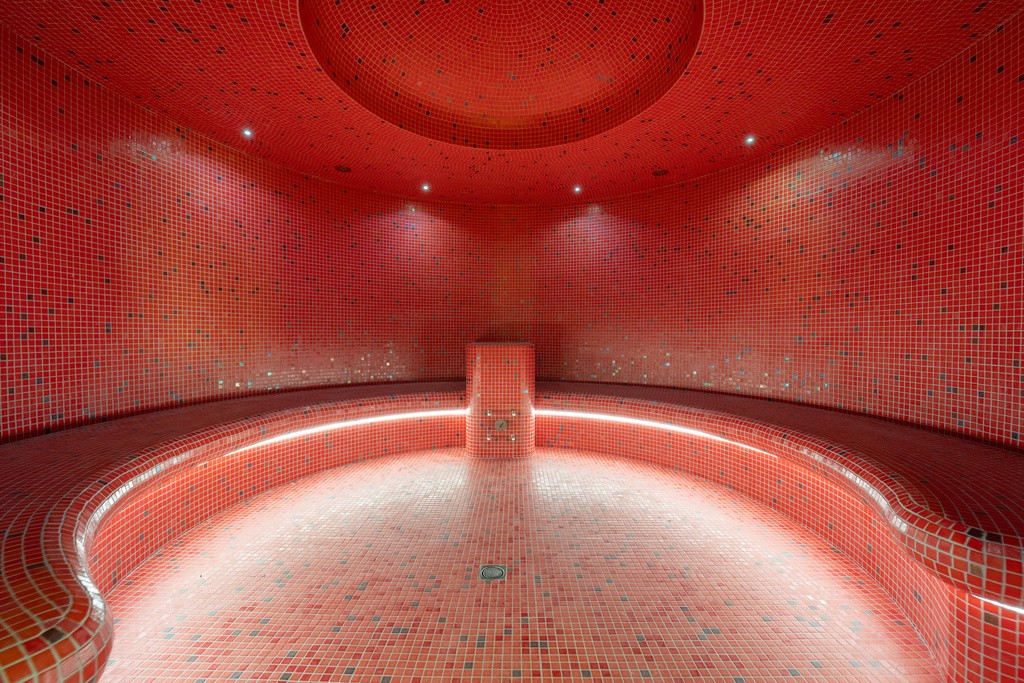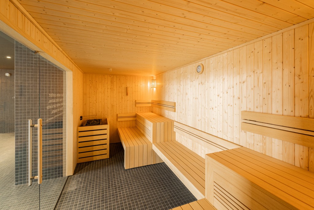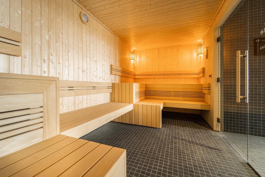 De Finse sauna van Alpha Wellness Sensations heeft een grote glazen voorwand om een open sfeer te creëren. De specifieke bankopstelling heeft een stuk dat opklapbaar is, zodat hier ook rolstoelgebruikers kunnen genieten van een deugddoende warmtesessie. De inrichting is uit vurenhout met traditionele saunalampen. Het stoombad ademt een Oosterse sfeer uit met de ronde vorm en rode mozaïektegels. Met de indirecte verlichting in de neus van de bank is het cosy gevoel compleet. Diezelfde verlichting maakt ook van de houten hottub in de hoek een pareltje. De halve cirkel in drie niveaus uit Canadese rode ceder is een luxueuze omkadering voor de spa die tien massagejets op je loslaat. Een beloning na het harde sporten!