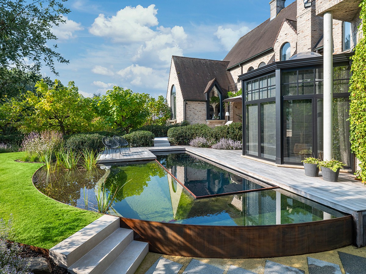 Art Pools creëerde een uniek zwart biozwembad dat te midden van een natuurlijke vijver ligt. Een strakke rand in cortenstaal markeert de grens tussen de zwemzone en het vijverwater, terwijl het zwevende terras in padoek het geheel een warme toets geeft. De donkere kleur van het water reflecteert de omliggende tuin en woning prachtig, waardoor het geheel bijna als een spiegel oogt. Deze realisatie is een knap staaltje technisch vakmanschap, waarbij architectuur, natuur en water samenvloeien tot een rustgevende oase met een bijzondere esthetiek.
