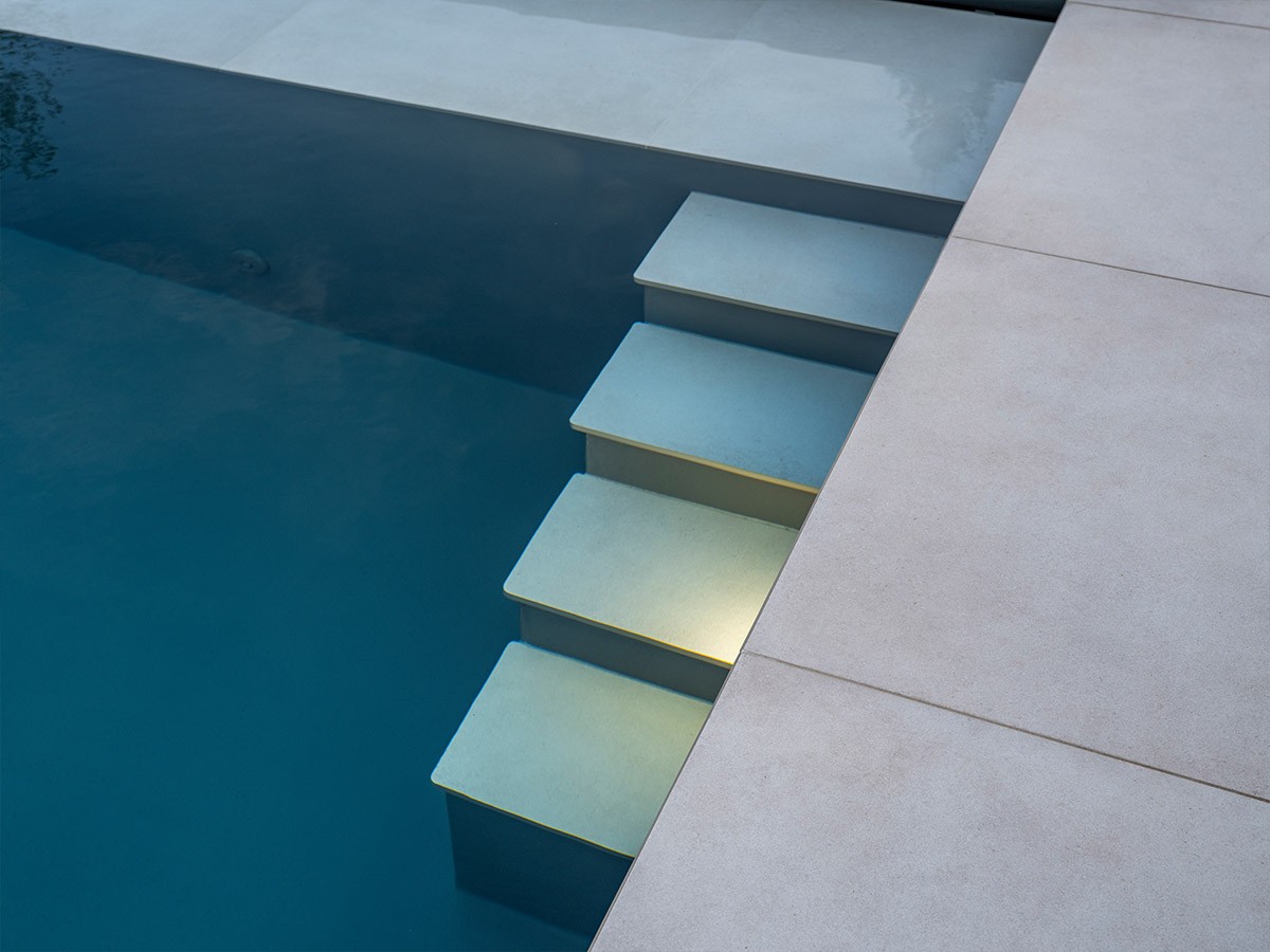 Bij deze moderne woning werd het hoogteverschil in de tuin op ingenieuze wijze opgevangen door een prachtig zwembad met een overlooprand in zwart graniet. Over de volledige lengte stroomt het water elegant over de boord, wat vanuit de woning een adembenemend infinity-effect oplevert. De strakke afwerking met lichte keramische terrastegels creëert een luxueuze en serene buitenruimte waar architectuur, water en landschap naadloos samenvloeien. De ingebouwde spa versterkt het gevoel van comfort en maakt de waterbeleving compleet.