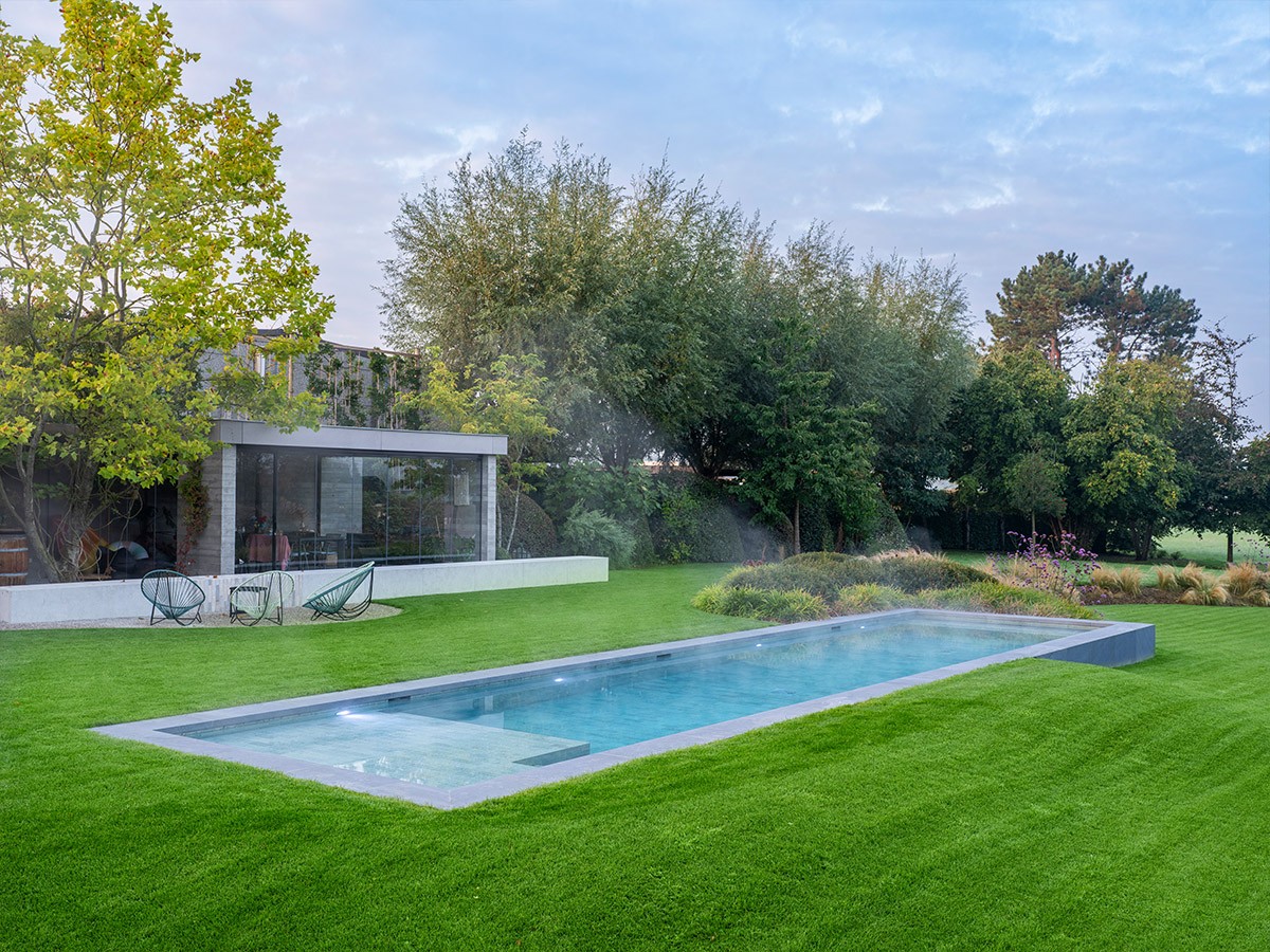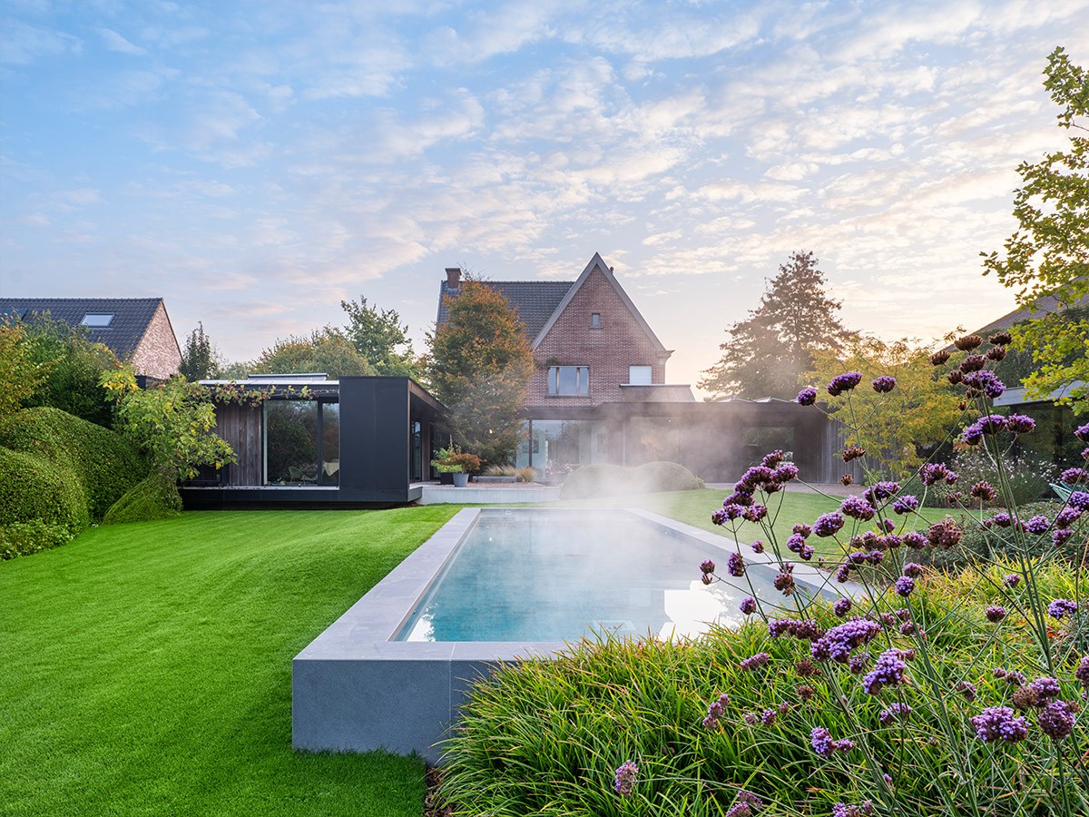 In deze moderne tuin vormt het zwembad in Balinese natuursteen een verfrissend middelpunt dat opgaat in de groene omgeving. De zachte groenblauwe tinten van de steen weerspiegelen de natuur rondom en creëren een gevoel van rust en klasse. De keramische boordafwerking in de COEM Ocean-reeks geeft het geheel een verfijnde uitstraling die mooi aansluit bij de natuurlijke setting. De techniek werd zorgvuldig geïntegreerd en het zwembad was op amper vier weken klaar voor gebruik. Een subtiel samenspel van innovatie, vormgeving en vakwerk.