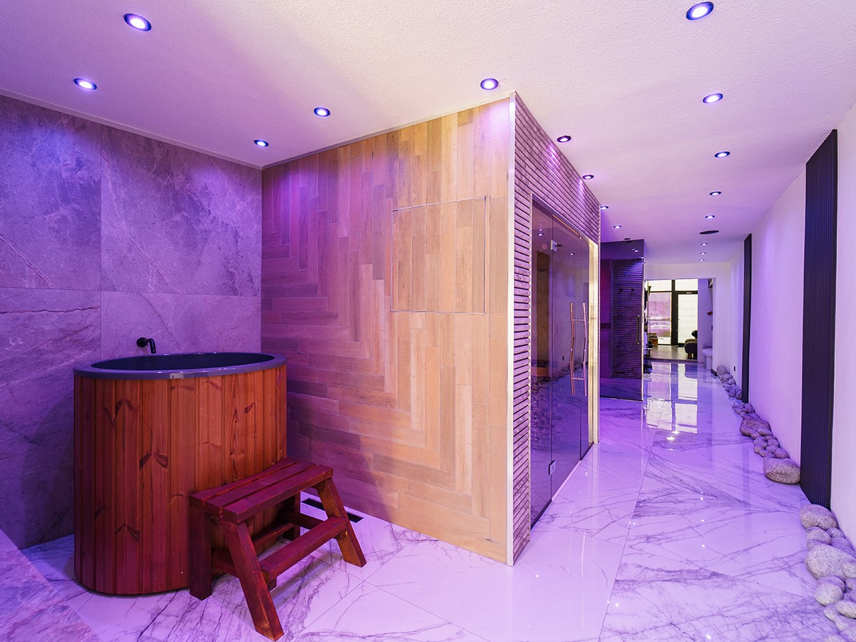 Deze privésauna, die ook voor verhuur wordt gebruikt, werd ontworpen als een echt pronkstuk van design en vakmanschap. De binnenafwerking combineert 3D-gevormd cederhout met wanden in steenfineer, speciaal ontwikkeld voor gebruik in de sauna. De glazen voorwand met inox handgreep en de krachtige HUUM HIVE-oven van 15 kW met 250 kg stenen maken lange opgietsessies mogelijk. De subtiele RGB-ledverlichting benadrukt de golvende lijnen en creëert een sfeervolle, moderne wellnesservaring. Een sauna die pure esthetiek en functionaliteit verenigt.