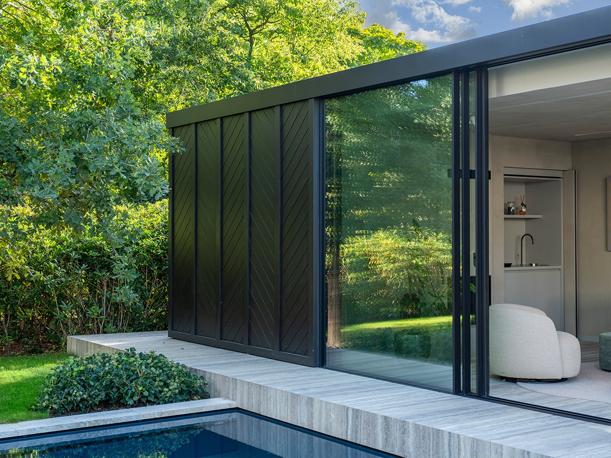 In Keerbergen bouwde BoGarden een modern poolhouse dat perfect aansluit bij de landelijke woning. Het ontwerp straalt rust en eenvoud uit dankzij de combinatie van zachte aardetinten, een natuurlijke Mortexafwerking en een vloeiende overgang tussen binnen en buiten. De gevel in donkerbruin visgraatmotief geeft karakter en diepte, terwijl de grote glazen schuiframen rondom voor een open, lichtrijke beleving zorgen. Binnen zorgen een gashaard en verfijnde interieurelementen voor een warme, huiselijke sfeer. Een stijlvol project waarin architecturale finesse en comfort samenkomen aan het water.