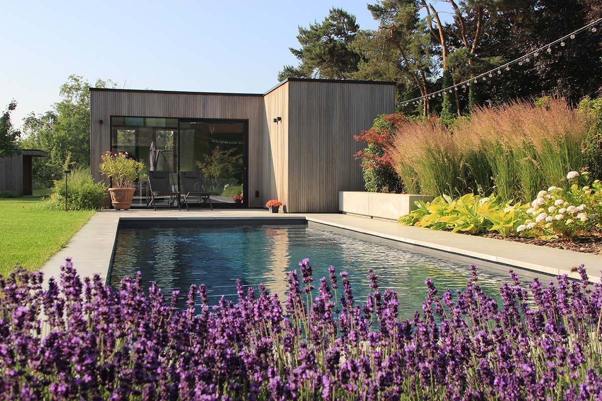 De sfeervol aangelegde tuin rondom het zwembad werd met veel zorg ontworpen en vormt een doordachte combinatie van groenblijvende planten en seizoensgebonden beplanting. Zo blijft de tuin het hele jaar door aantrekkelijk en ontstaat er een mooi groen kader dat tegelijk voor de nodige privacy zorgt. De variatie in bladstructuren geeft het geheel extra diepte en karakter.