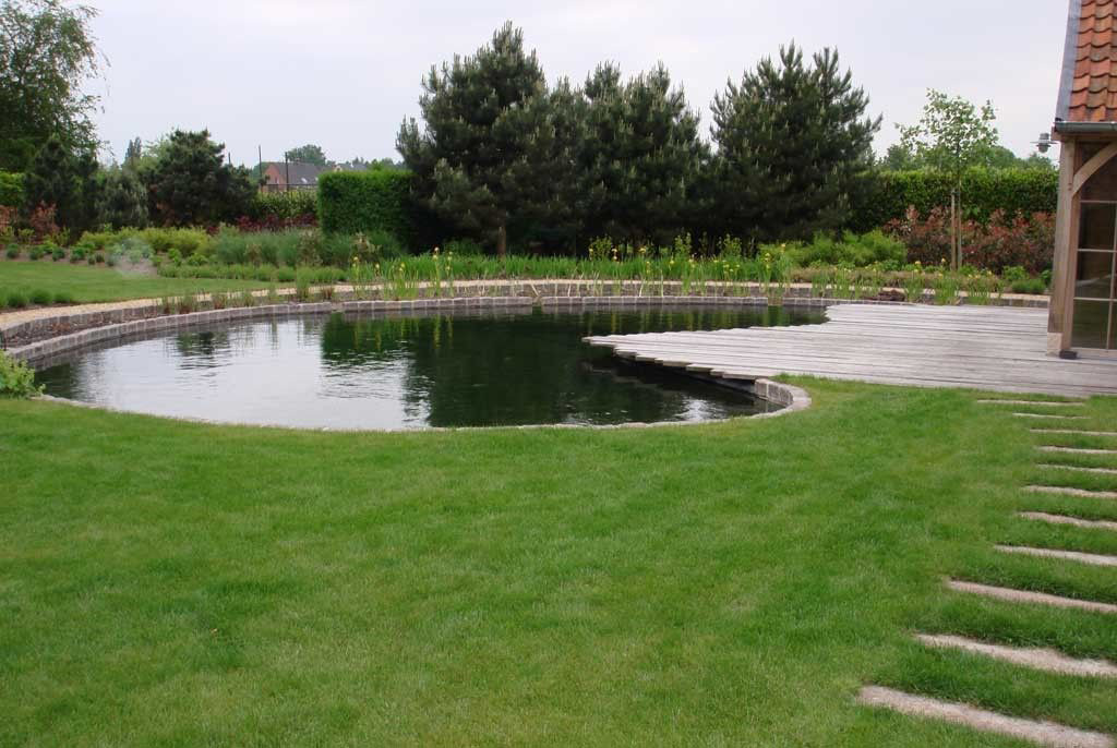 Deze vijver heeft een ronde vorm wat het natuurlijke effect benadrukt en de vijver beter laat opgaan in deze tuin. Om deze reden werd ook gekozen voor een Zweedse kasseiklinker in plaats van blauwe hardsteen. Het water loopt over de tussenmuur van de zwemvijver naar de filter. Hier wordt het door de lava gefilterd en via twee pompen terug naar de zwemvijver gestuurd.Dit creëert een skimmer-effect aan de oppervlakte waardoor bladeren en dergelijke, die op het wateroppervlak terecht komen, afgevoerd worden naar de filter in plaats van te bezinken naar de bodem. Een extra, mooie aanvulling op deze vijver is het terras dat gemaakt is uit het hout van de bodem van een boot die zou vernietigd worden.