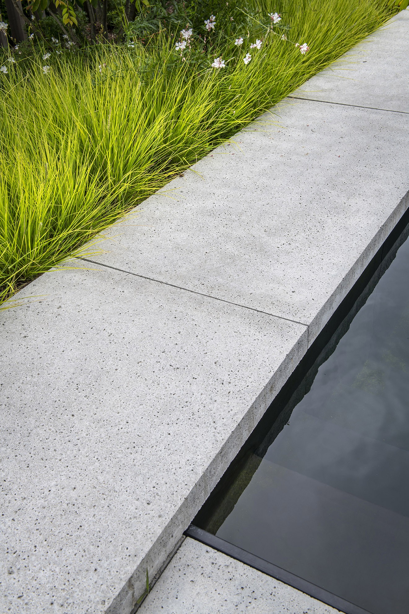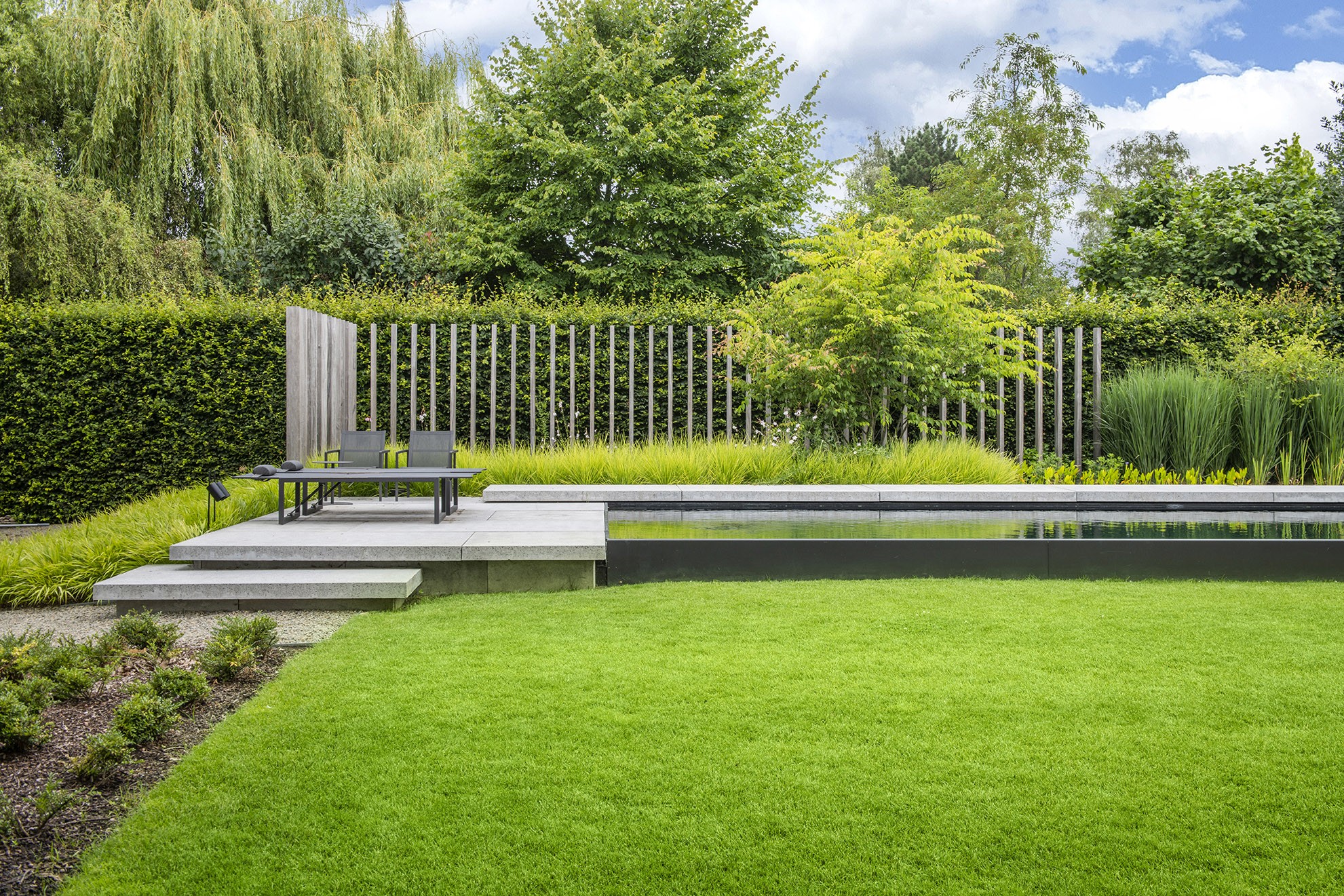 In deze ruime tuin, met uitzicht op het Hasseltse platteland, slaat de zwemvijver een brug tussen de woning en achterliggende weilanden. Deze zwemvijver is lang, slank en afgewerkt met een stalen randprofiel voor een moderne en strakke uitstraling. Aan de zijkant scheidt een loper uit structuurbeton de zwemvijver en plantenzone van elkaar. Dit ‘wandelpad’ leidt naar het zonneterras met zwevende trap aan de achterzijde. Het terras aan de woning is van hardhout, waardoor je het idee van een houten vlonder krijgt. Van de zwemvijver tot de tuinaanleg, Puur toont hier vakmanschap van hoog niveau.