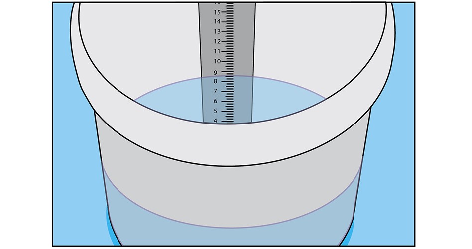 5. Markeer het waterpeil van het zwembad aan de buitenkant van de emmer met H.