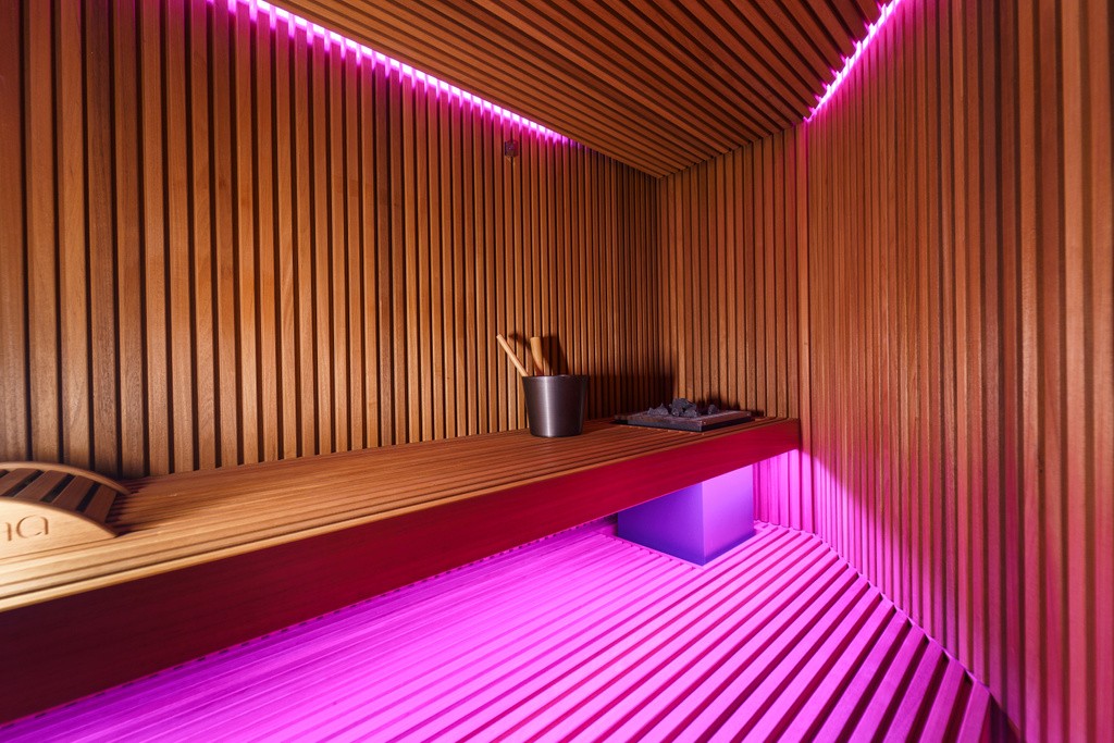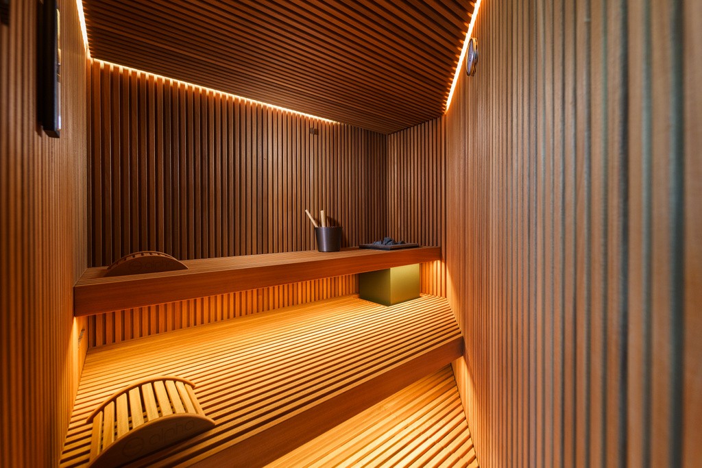 Een tweede moderne invulling zien we in de plaatsing van de saunaoven. Deze is namelijk ingewerkt in de bovenste bank. Het betreft een vierkante versie die makkelijk te bedienen is via wifi en de touch-sturing. Deze plaatsing van de oven op hoogte maakt het niet alleen eenvoudig om een fijne opgieting te doen, maar het is ook een slimme plaatsbesparing. Deze sauna heeft vooraan een schuine wand waardoor de ruimte achter de glazen toegangsdeur eerder beperkt is. Omdat hier nu geen oven moet staan, dient er niet op ligruimte te worden ingeboet. Alpha Wellness Sensations wist dus de ruimte optimaal in te kleden, perfect naar wens van de klant.