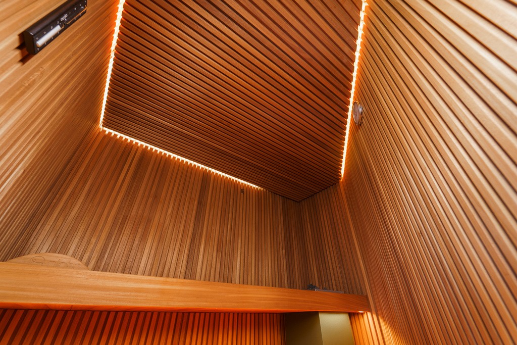 Een echt moderne invulling van de klassieke Finse sauna mogen we dit design noemen. Vloer plafond, wanden en banken schitteren allemaal in hout. Door te kiezen voor smalle latjes van 18 x 28 mm ontstaat een heel eigentijdse, moderne inkleding van de ruimte. Het thermisch behandelde ayous was hiervoor de uitgelezen houtsoort. Indirecte ledverlichting in het plafond en onder de banken, doet het lijnenspel van de latjes alle eer aan.
