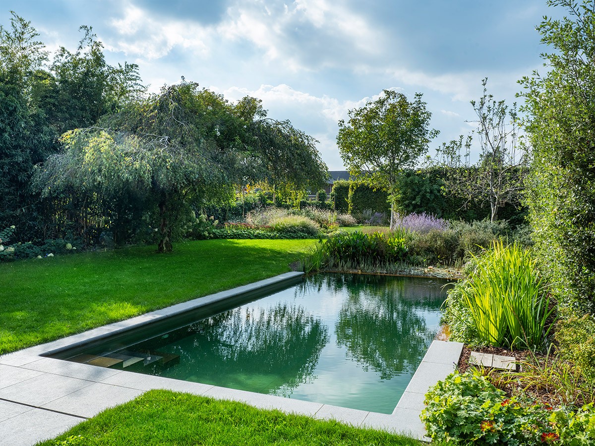 Deze zwemvijver is een prachtig voorbeeld van ecologisch en technisch evenwicht. Met een Biotop-systeem dat zorgt voor natuurlijke filtratie en helder water zonder chemicaliën, combineert het project innovatie met esthetiek. De hellende bodem, de regeneratiezone met klei en waterplanten, en de boord die deels uit cortenstaalprofielen en deels uit natuurstenen tegels bestaat, zorgen samen voor een geheel dat naadloos opgaat in de tuin. Een hedendaags ontwerp dat rust, natuur en technologie verenigt.