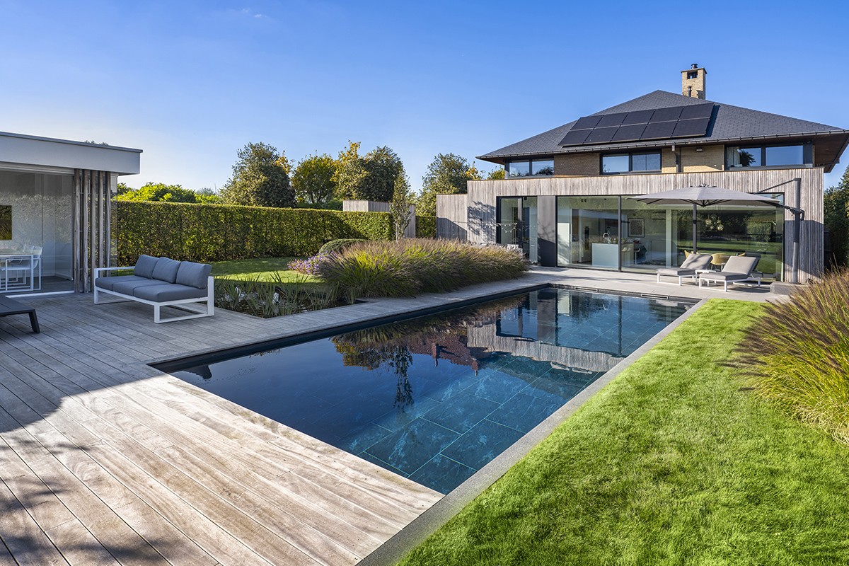 Dit stijlvolle project, gerealiseerd door Hybrid Pools, combineert de natuurlijke uitstraling van een zwemvijver met het comfort van een modern zwembad. Dankzij een innovatief hydrolysesysteem blijft het water langdurig kristalhelder, zonder dat er chemische producten nodig zijn. De strakke lijnen, het antracietkleurige wateroppervlak en de verfijnde beplanting met kalmoes, beekpunge en iris versterken samen de rustgevende sfeer. Een perfect samenspel van techniek, esthetiek en natuur, waarin luxe en eenvoud hand in hand gaan.
