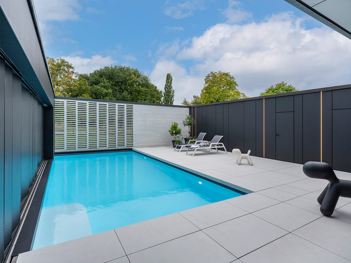 Dit prachtige zwembad werd geïntegreerd in een modern patio-ontwerp. De geperforeerde aluminium wand zorgt voor een gevoel van openheid én privacy, terwijl het zonlicht subtiel speelt op het heldere water en de witte keramische tegels van het terras. De centrale positionering van de waterpartij creëert een oase van rust, afgeschermd van de buitenwereld. Bovendien versterkt de ligging, centraal tussen de leefruimtes, het zwembad als verlenging van het dagelijkse wooncomfort. Een innovatief ontwerp waarin architectuur, licht en ruimte samen een serene leefervaring vormen.