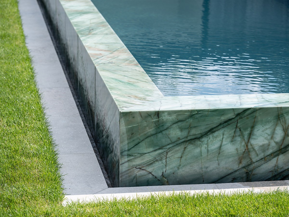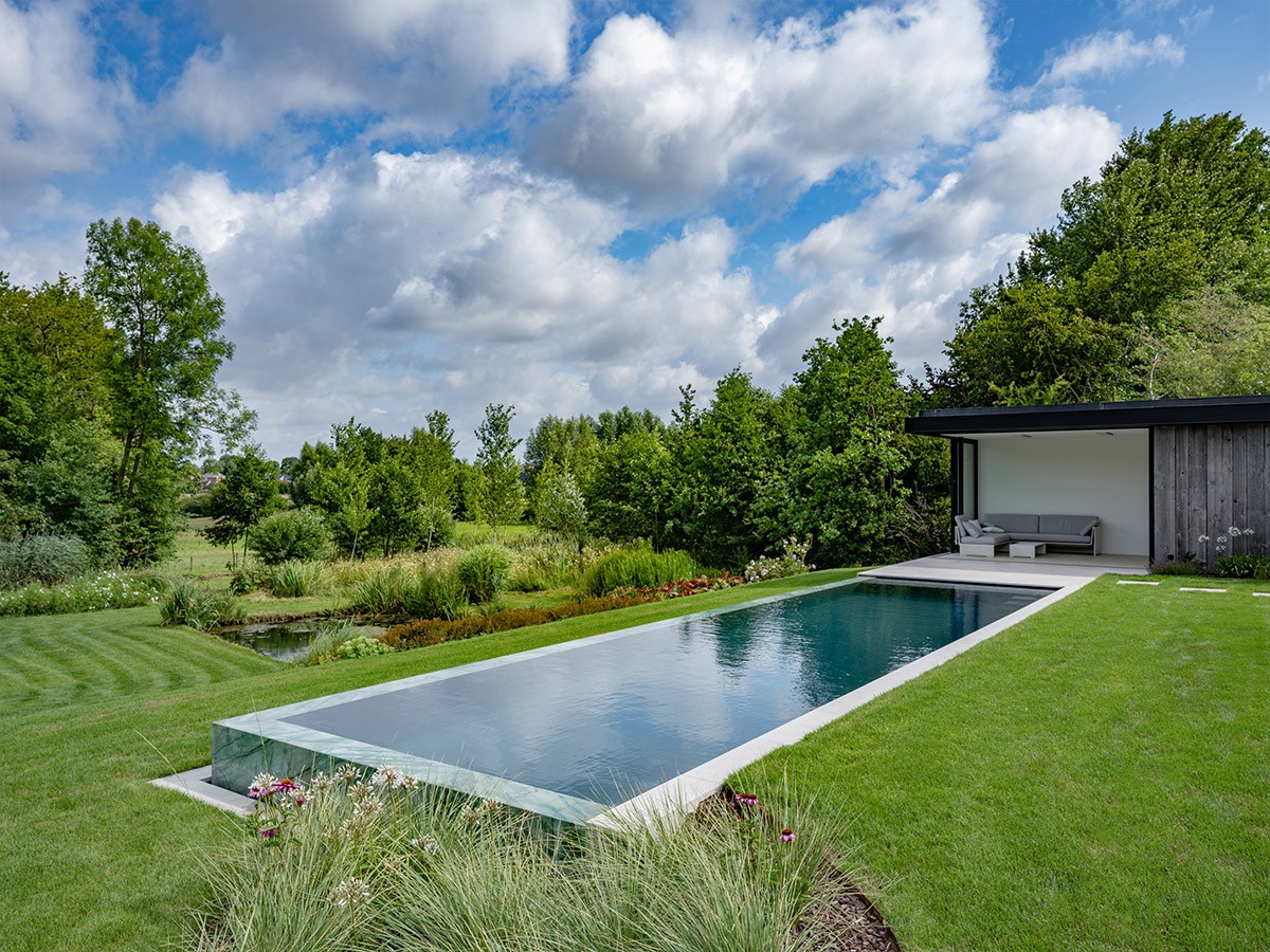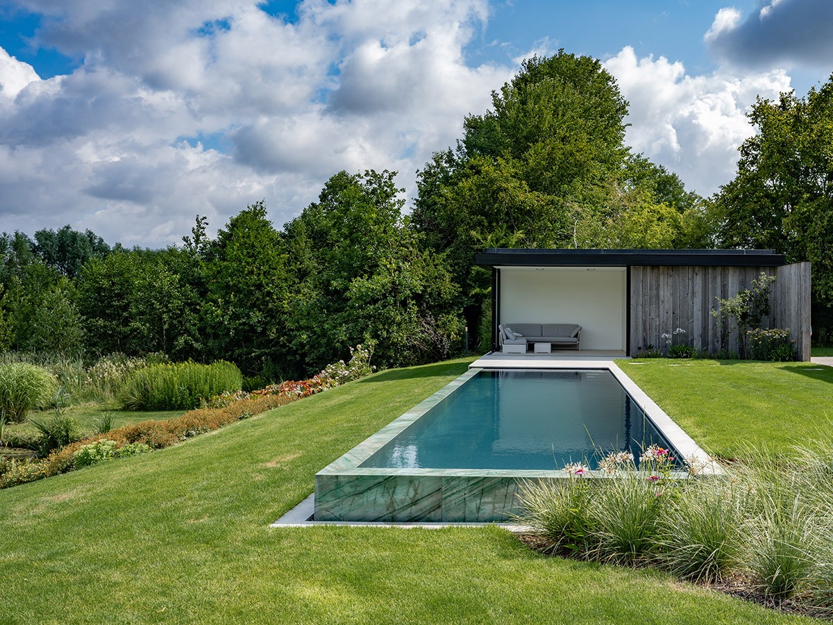 Aan de rand van een weids landschap realiseerde Art Pools een infinitybiozwembad dat zich opent naar de omgeving en het gevoel van rust versterkt. De groene natuursteen van de boord- en overlooprand zorgt voor een subtiele verbinding tussen water, gras en poolhouse. Dankzij de hydrolysetechniek blijft het water helder zonder chemicaliën. Het strakke lijnenspel en de zachte groentinten brengen architectuur en natuur in perfecte balans. In de tuin heerst er een sfeer van sereniteit en verfijning.
