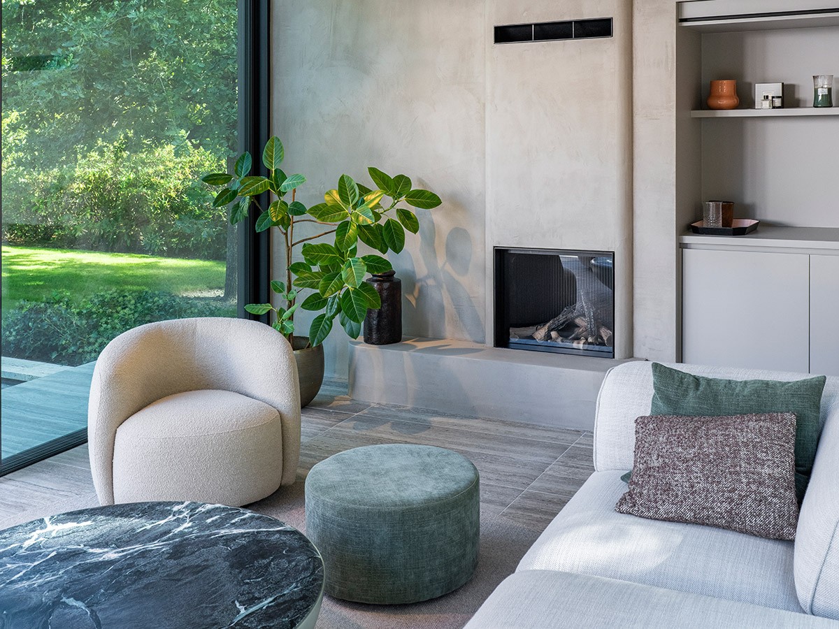 In Keerbergen bouwde BoGarden een modern poolhouse dat perfect aansluit bij de landelijke woning. Het ontwerp straalt rust en eenvoud uit dankzij de combinatie van zachte aardetinten, een natuurlijke Mortexafwerking en een vloeiende overgang tussen binnen en buiten. De gevel in donkerbruin visgraatmotief geeft karakter en diepte, terwijl de grote glazen schuiframen rondom voor een open, lichtrijke beleving zorgen. Binnen zorgen een gashaard en verfijnde interieurelementen voor een warme, huiselijke sfeer. Een stijlvol project waarin architecturale finesse en comfort samenkomen aan het water.
