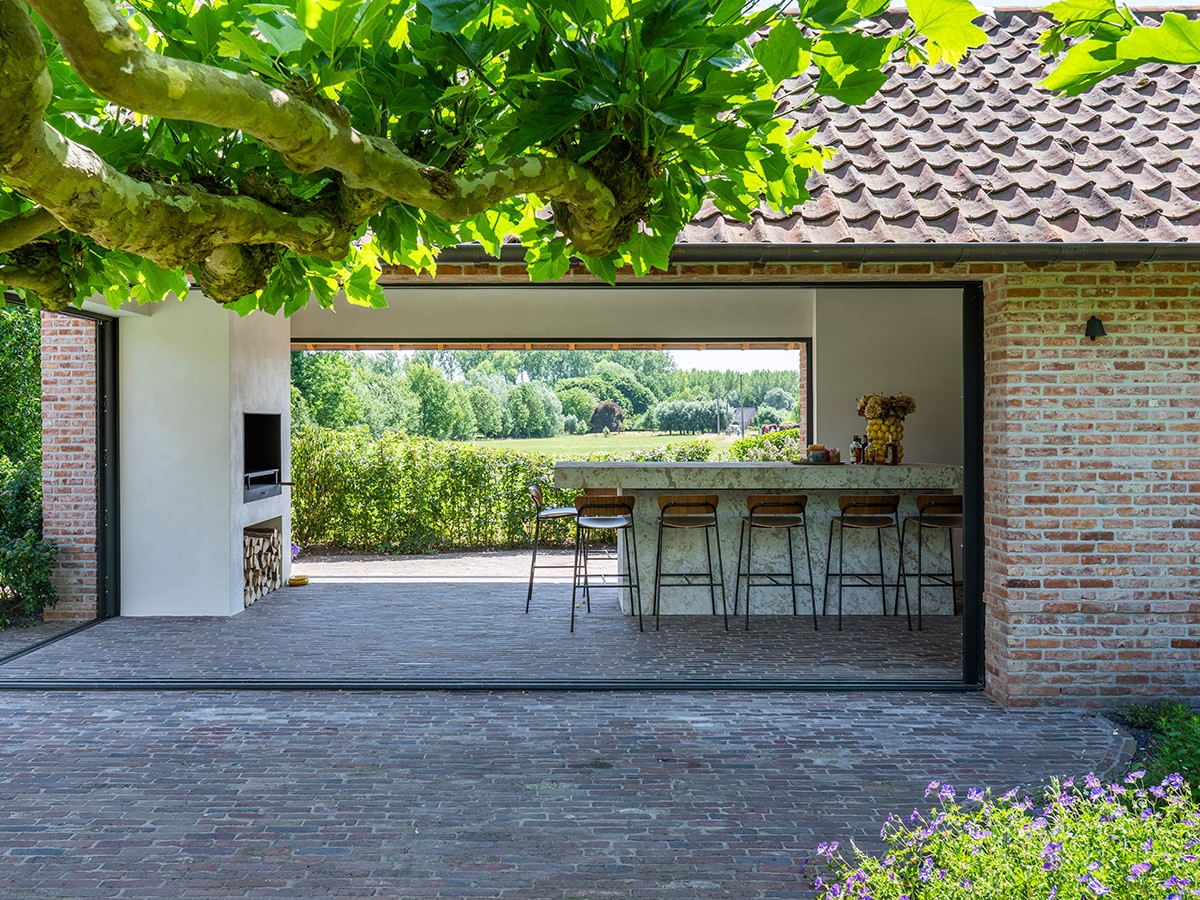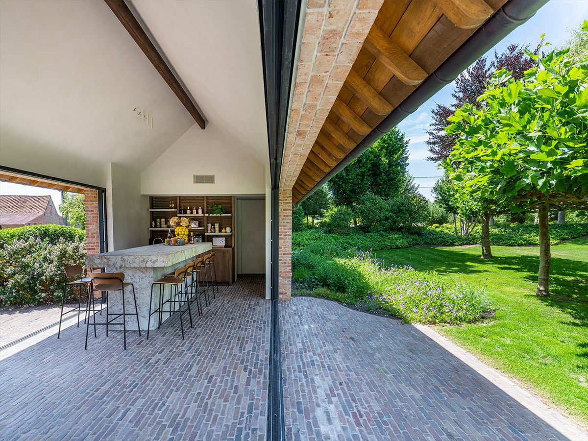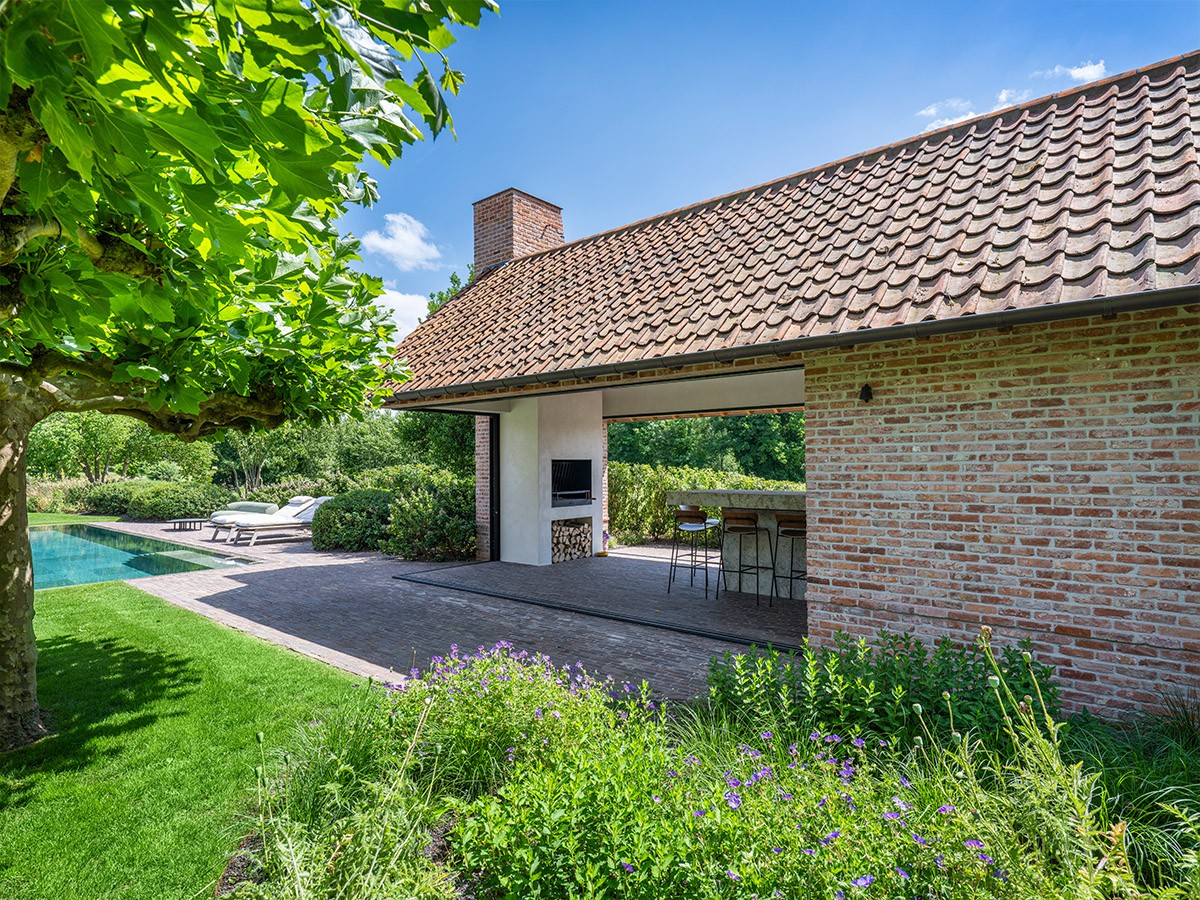 Dit vrijstaande poolhouse vormt een warme en uitnodigende rustplek in de tuin. De recuperatiekleiklinkers lopen van het terras door tot binnen, waar een luchtig interieur in stucverf en een uitnodigend keukeneiland de toon zetten. Het zadeldak met Boomse pannen en de gevels uit Beerse klinkers geven het gebouw zijn landelijke maar toch tijdloze karakter. Het zwembad heeft vier overloopranden die een prachtig spiegelend effect creëren. Vlindermagneten zoals Hydrangea macrophylla Bouquet Rose en Escallonia Pink Elle zorgen voor een zachte groene omlijsting. Dankzij de zorgvuldige positionering vormen poolhouse en zwembad een vanzelfsprekende blikvanger in de tuin, op maat van het landschap.
