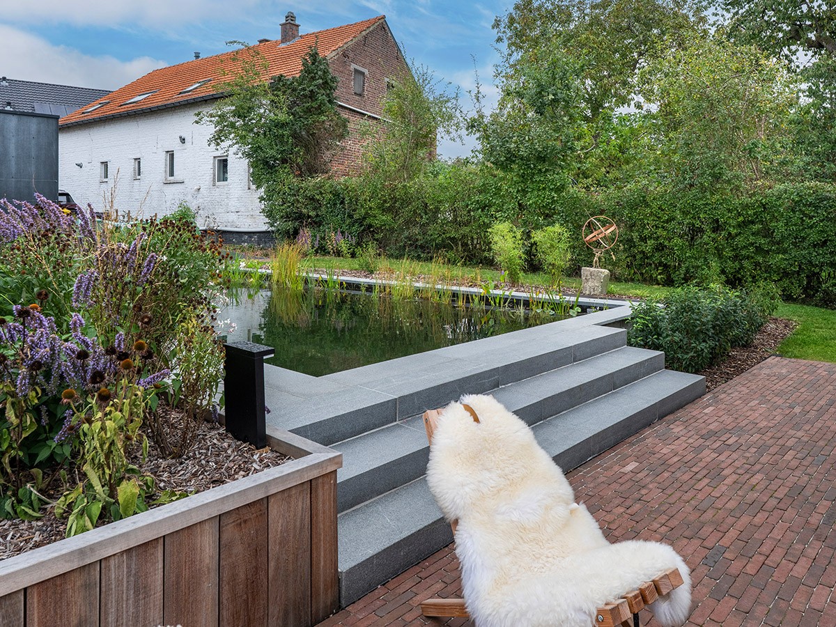Deze tuin heeft een weids uitzicht en wordt gekenmerkt door een prachtige, rechthoekige zwemvijver die rust en eenvoud uitstraalt. De granieten boordstenen zorgen voor een verzorgde afwerking, terwijl het hoogteverschil in het terrein stijlvol wordt opgevangen met een trap in natuursteen die een subtiele overgang vormt naar het charmante poolhouse. In de moeraszone zorgen gele lis, watermunt, dotterbloem, kalmoes en pijlkruid voor een natuurlijke filtering en een levendige toets. Een perfect samenspel van techniek en natuurlijke elegantie.